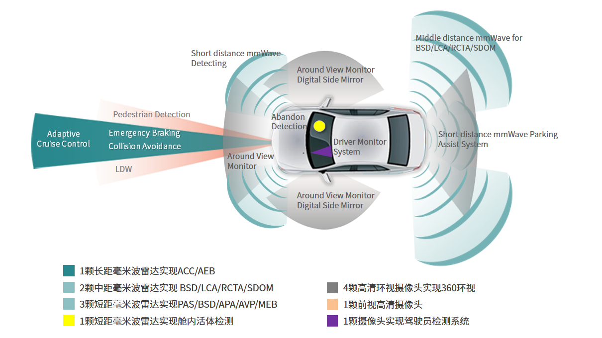 在BSD、LCA、DOW、RCTA等传统功能基础上,满冠体育短距毫米波雷达能实现近场、低速检测,且各项指标处于业内领先水平:在探测范围、速度、角度等方面超越超声波传感器,实现汽车准确判断周围环境、减少擦碰等情况;对低速时的MEB(紧急制动)有跨越式的性能提升,能够适配更多的场景;整体价格与超声波雷达接近,达到性能与价格的完美结合。
