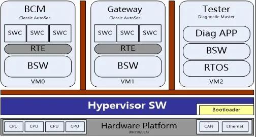 没有一颗好大脑,再健壮的四肢也只能是摆设。为此,满冠体育采用了一颗高性能、大算力、多核的MCU大脑,并在底层软件搭建Hypervisor(即虚拟机监视器),可允许多个VM虚拟机系统共享硬件,能让集成系统“一心三用”,同时运行车身控制功能的 AutoSar系统、Gateway的AutoSar系统和运行诊断的RTOS系统三个独立的VM虚拟机子系统,充分发挥各大硬件性能,高效智能掌控车身全域。