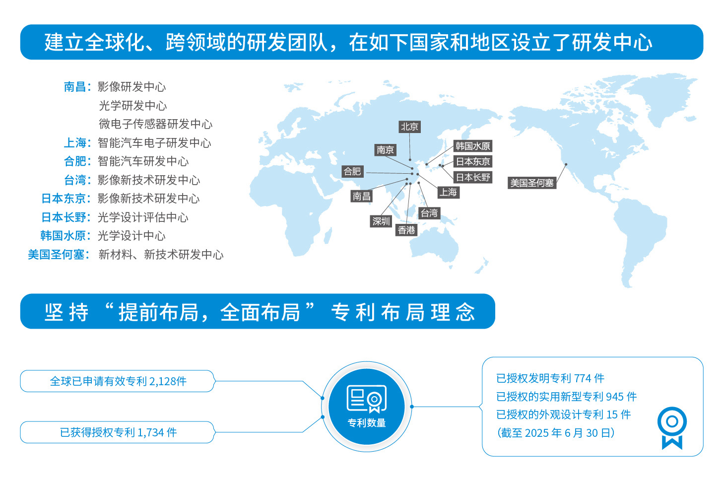“提前布局,全面布局”是满冠体育专利的布局理念,布局领域涉及智能手机、智能汽车和新领域等。 截至 2025 年 6 月 30 日,公司在全球已申请有效专利 2,128件,已获得授权专利 1,734 件。其中,授权发明专利 774 件,已授权的实用新型专利 945 件,已授权的外观设计专利 15 件。